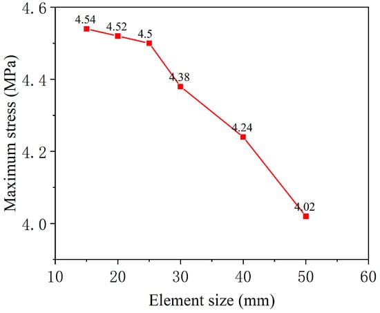 To determine the appropriate mesh size for the finite element model, a mesh sensitivity analysis was conducted. Six different element grid lengths were compared: 50 mm, 40 mm, 30 mm, 25 mm, 20 mm, and 15 mm. A temperature gradient load of 60 °C/m was applied to the model, and the computational results for each case were analyzed. Figure 5 illustrates the maximum stress values in the CA mortar layer for different element sizes. As the element size gradually decreased, the stress values increased correspondingly. However, the stress variation stabilized when the element grid length was ≤25 mm. Specifically, the maximum stress for the 15 mm element size was only 0.89% higher than that for the 25 mm, whereas the maximum stress for the 25 mm element size was 8.95% higher than that for the 50 mm. Reducing the number of elements appropriately is beneficial for improving computational performance. Therefore, the element grid length for the CA mortar layer in the model was set to 25 mm. The finite element model has a total of about 1.5 × 106 elements.