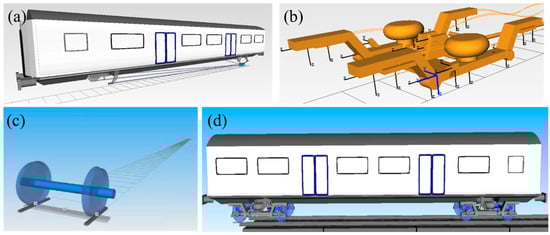 High-speed train mode: (a) vehicle body, (b) bogie, (c) wheel, and (d) whole model.