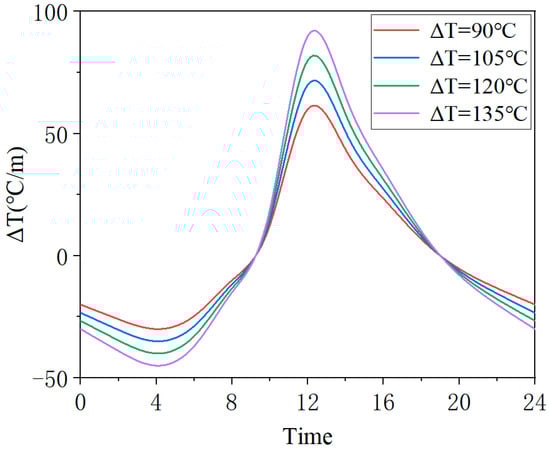 The investigation of CA mortar damage evolution necessitates long-term cyclic numerical simulations, with this study employing a daily cycle as the fundamental unit. Two types of loads—temperature gradient load and train load—are applied to the model within each day. The temperature gradient of the ballast track varies continuously throughout the day. Since different external temperature environments also influence the temperature gradient loads within the ballast track, it is essential to compare and analyze the damage evolution of the CA mortar layer under various temperature gradient loads. Table 4 presents the maximum positive and negative temperature gradients for four different temperature gradient loads used in this study’s numerical simulation, where ΔT represents the difference between the maximum positive and negative temperature gradients. According to the standard [52], the temperature gradient corresponding to Condition No. 1 represents the extreme operational temperature gradient. Based on the tested temperature gradient values over different days in reference [31], the maximum positive temperature gradient within a day reaches at least 60 °C/m, while the maximum negative temperature gradient within a day reaches at least 30 °C/m. Therefore, these values were adopted as the temperature gradient for serial number 4. For ΔT, a step size of 15 °C/m was used to determine the maximum temperature gradient values corresponding to Condition No. 2 and 3. The maximum temperature gradients typically occur at 12 a.m. and 4 a.m. The temporal variation of these four temperature gradient loads is depicted in Figure 7, with the loads applied to the ballastless model according to the temperature gradient changes at different times.