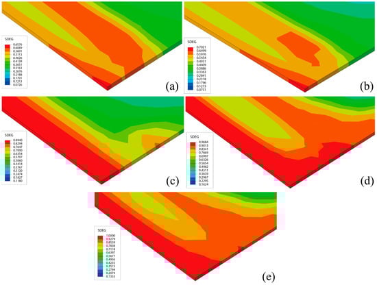 Distribution of damage variables over different days: (a) day 240: Dmax = 0.6575, (b) day 270: Dmax = 0.7021, (c) day 360: Dmax = 0.8940, (d) day 450: Dmax = 0.9684, (e) day 566: Dmax = 1.
