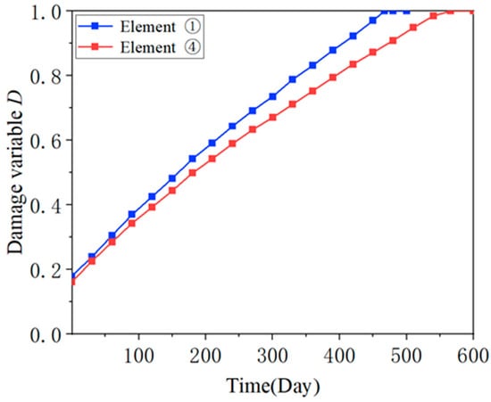 In the simulation, the damage variables of four consecutive adjacent elements at the corners of the slab along the transverse direction are consistently larger. To differentiate them, these four consecutive adjacent units are numbered from the outside to the inside as ① to ④. When the simulation reached day 467, the damage variable of unit ① reached 1, and macroscopic damage began to appear in the CA mortar layer. However, at this time, the cracked area in the CA mortar layer was relatively small and had not yet met the “immediate repair” level according to the maintenance standards. On day 566, the damage variable of unit ④ also reached 1. At this point, all four consecutive adjacent units had damage variables of 1, and the CA mortar layer reached the “ immediate repair” level. Figure 9 shows the evolution of the damage variables of unit ① and unit ④ over the course of the simulation: initially, each element had a small initial damage, which gradually increased to 1 as the number of days increased, with a smooth growth rate and minimal change.