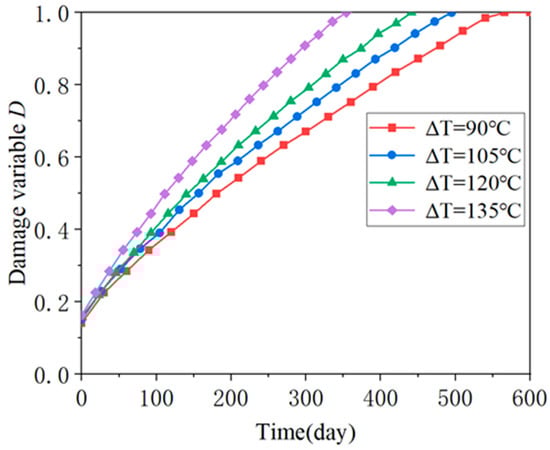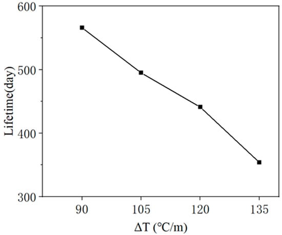 Figure 10 illustrates the evolution of the damage variable of unit ④ under different temperature gradient loads, which can indicate when the CA mortar layer reaches the “immediate repair” level under varying temperature gradients. Figure 11 shows the relationship between lifetime and ΔT. As ΔT increases, there is a clear trend of more rapid deterioration in the CA mortar layer. In the extreme case where the ballastless track is subjected to a temperature gradient of ΔT = 135 °C/m, the CA mortar enters the “immediate repair” level after 354 days. In a milder situation with ΔT = 90 °C/m, it takes 566 days for the CA mortar to reach this level. Therefore, according to the simulation, most CA mortar layers can serve in ballastless tracks for approximately 1 to 2 years. This aligns with the 1-year maintenance cycle mentioned in previous studies, reflecting the reasonableness of the maintenance specifications for high-speed railways.