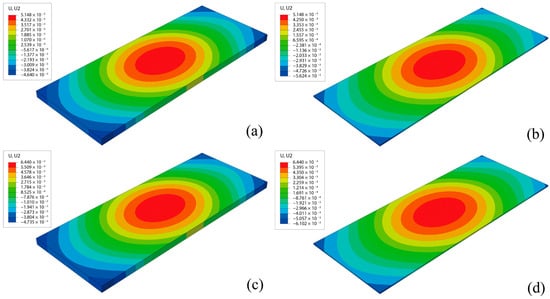 Vertical displacement of track slab and CA mortar: (a) track slab, Day 480; (b) CA mortar layer, Day 480; (c) track slab, Day 566; (d) CA mortar layer, Day 566.