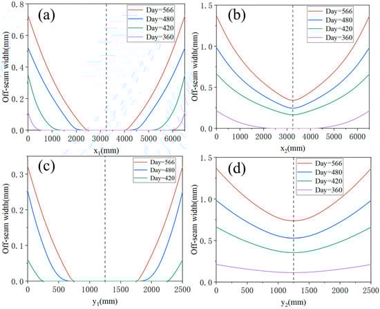 The distribution of off-seam width can also be analyzed. Figure 13 presents a schematic diagram of the CA mortar layer, marking four directions: direction x1—the center of the slab along the longitudinal direction; direction x2—the edge of the slab along the longitudinal direction; direction y1—the center of the slab along the transverse direction; direction y2—the edge of the slab along the transverse direction. Figure 14 illustrates the distribution of off-seam width along these four directions on different days. In Figure 14, the vertical axis represents the off-seam width, while the horizontal axis indicates the distance from the starting point in each direction. In the transverse direction, the off-seam width initially decreases and then increases, gradually narrowing from the edge toward the center of the plate and being symmetrically distributed. At the same distance, the off-seam width in direction y2 is greater than that in direction y1, and off-seams appear in direction y2 before they do in direction y1. After 566 days, some areas in direction y1 still do not exhibit off-seams. The distribution of off-seams in the longitudinal direction mirrors that in the transverse direction, with the off-seam width also decreasing first and then increasing symmetrically. At the same distance, the off-seam width in direction x2 is greater than that in direction x1, and some areas in direction x1 remain off-seam-free until day 566. The off-seam width is larger in the edge regions (directions x2 and y2) compared to the central regions (directions x1 and y1), with the maximum off-seam width occurring at the corners of the plate.