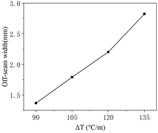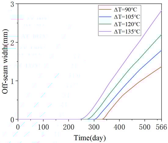 Similar to the analysis of crack damage, the off-seam damage analysis necessitates a comparative study of the damage evolution of the CA mortar layer under various temperature gradient loads. The temperature gradient loads are described in Table 4 and Figure 7. Figure 15 presents the curves of the maximum off-seam width of CA mortar over time under different working conditions. Under mild conditions (ΔT = 90 °C/m), the CA mortar began to exhibit off-seam damage with the track slab on day 316. As ΔT increased, the onset of off-seam damage occurred earlier: it appeared on day 281 for ΔT = 105 °C/m, on day 251 for ΔT = 120 °C/m, and on day 225 for ΔT = 135 °C/m. Figure 16 illustrates the relationship between off-seam width and ΔT on day 566. As ΔT increases, the off-seam width at the end of the calculation also increases. For the different cases, ranging from the most extreme to the mildest conditions, the off-seam widths on day 566 reached 2.826 mm, 2.203 mm, 1.792 mm, and 1.367 mm, respectively. In the two milder cases, the off-seam widths did not exceed the rapid repair criterion of 2 mm. However, in the more extreme cases, the off-seam widths surpassed 2 mm, indicating that repairs were necessary. These results demonstrate that the temperature gradient significantly influences the separation behavior between the CA mortar and the track slab.