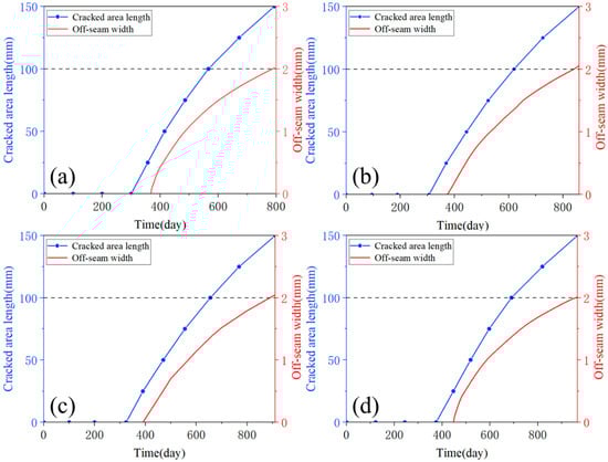 Figure 17 illustrates the evolution of crack length and maximum off-seam width over time for different conditions. Since the length of each element in the finite element model is set to 25 mm in this study, the development curve of damage length over time can only be extracted when the damaged area length reaches a multiple of 25 mm, with scattered points connected to form the graph. As shown in Figure 17, the development trends of crack length and off-seam width are essentially similar across the four cases, leading to the assumption that the damage evolution trend is similar for all other conditions. So, it can be obtained that the choice of elastic modulus does not actually have a significant effect on this part of the analysis.