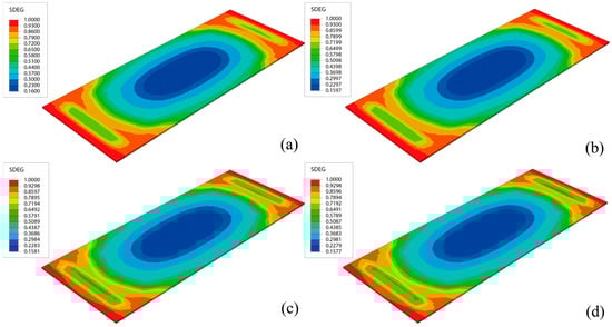 Damage distribution in CA mortar layer when crack length reaches 100 mm: (a) h = 30 mm, E = 7000 MPa, ρ = 1770 kg/m3; (b) h = 40 mm, E = 7000 MPa, ρ = 1770 kg/m3; (c) h = 50 mm, E = 7000 MPa, ρ = 1770 kg/m3; (d) h = 50 mm, E = 7000 MPa, ρ = 1770 kg/m3.