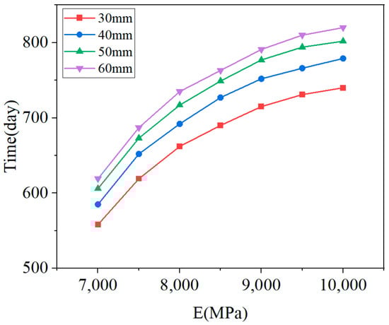 In Section 2, the physical properties of CA mortar were discussed, and the relationship between the elastic modulus and the density of CA mortar was established based on the physical properties of CA mortar prepared in various studies. Therefore, controlling the elastic modulus of CA mortar can also effectively control its density. In this section, we explore the damage evolution of CA mortar under different physical properties. According to the specifications, the elastic modulus of CA mortar should be controlled within the range of 7000 MPa to 10,000 MPa, with increments of 500 MPa. Thus, the elastic modulus values considered are 7000 MPa, 7500 MPa, 8000 MPa, 8500 MPa, 9000 MPa, 9500 MPa, and 10,000 MPa. Corresponding densities are calculated using Equation (7). Additionally, the thickness of the CA mortar layer should be controlled between 30 mm and 60 mm, with increments of 10 mm, resulting in thicknesses of 30 mm, 40 mm, 50 mm, and 60 mm. Consequently, this section involves a total of 4 × 7 = 28 conditions, as detailed in Table 7. The train load is applied in the same manner as in the previous section, with ΔT = 90 °C. As analyzed in Section 3, the lifetime of CA mortar primarily depends on when the crack length reaches 100 mm, so the numerical simulation is halted once the crack length of the CA mortar layer reaches 100 mm.
