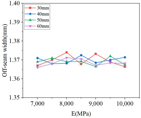 Comparison of crack length and maximum off-seam width: (a) E = 7000 MPa, (b) E = 7500 MPa, (c) E = 8000 MPa, (d) E = 8500 MPa.