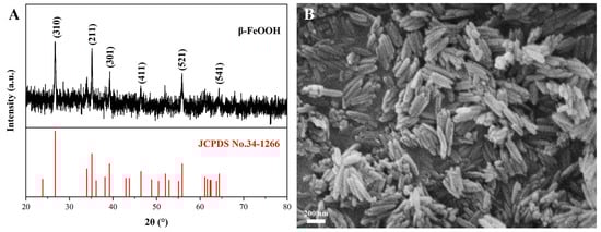 The XRD pattern and SEM morphology of the β-FeOOH NRs fabricated at 100 °C for 8 h in a 70 mL solution containing FeCl3 of 0.171 M and PVP of 0.163 mM are revealed in Figure 1. It was found from the XRD pattern (Figure 1A) that the X-ray diffraction peaks at 26.7°, 35.1°, 39.2°, 46.4°, 55.9°, and 64.4° were perfectly fitted to the β-FeOOH standard PDF card (JCPDS No. 34-1266), which affirmed that the product belonged to the phase of β-FeOOH. Figure 1B shows their SEM morphology; obviously, the structures of the products were nanorods, and their average diameter and length reached 43.2 nm and 193.1 nm, respectively. All the above results demonstrated that β-FeOOH NRs were successfully fabricated.