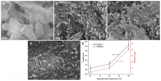 The solutions of 70 mL containing 0.171 M FeCl3 and 0.163 mM PVP reacted at various temperatures for 10 h via the hydrothermal process; the SEM morphologies of the as-prepared products are revealed in Figure 5. From Figure 5A, when the hydrothermal treatment was 40 °C, the β-FeOOH NRs were unformed, while rod-shaped β-FeOOH precursors with a well-arranged and good morphology were formed, as in Figure 5B–D, as the hydrothermal temperature was enhanced from 60 °C to 100 °C. Their average length increased from 165.1 nm and 265.5 nm, while the average diameter increased from 41.3 nm and 56.4 nm, which is shown in Figure 5E; with the increase in hydrothermal temperature, the morphology of the nanorods became uniform, and the size increased gradually. The reason for this was that the solubility of the FeCl3 increased with the rise in hydrothermal temperature; then, the concentration of Fe3+ in the solution expanded, which was advantageous to the growth of the crystals. The yield (Table 1) of β-FeOOH NRs increased rapidly from 0.91% to 28.19% with the rise in hydrothermal temperature. According to the above the results, the optimum hydrothermal temperature was selected as 100 °C for the fabrication of β-FeOOH NRs.