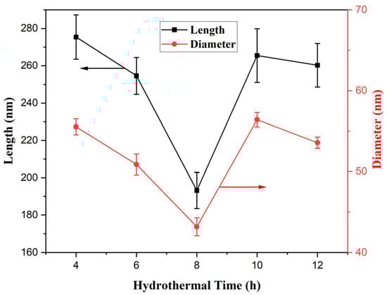 The SEM morphologies of the products fabricated at 100 °C for different hydrothermal times in each 70 mL solution containing 0.171 M FeCl3 and 0.163 mM PVP are shown in Figure 6; obviously, the products fabricated for hydrothermal times of 4–12 h were rod-structured, but they failed to form rod structures for hydrothermal time of 2 h. At the same time, the average diameter and length of the β-FeOOH NRs decreased with the time prolonging from 2 h to 8 h and then increased when the time continued to prolong; the experimental data are shown in Figure 7. The reason might be that the extension of time was advantageous to the dehydration reaction of Fe(OH)3, and β-FeOOH NRs with a short length and uniform morphology were produced. The yield of β-FeOOH NRs increased first and then decreased with the increase in hydrothermal time, as listed in Table 1. According to the yield and the size of the nanorods, the optimal hydrothermal time was 8 h.