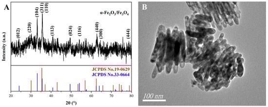 Taking β-FeOOH NRs as precursors, α-Fe2O3/Fe3O4 MNCs were prepared via the combustion-reduction process with galactose as a reducing agent. Figure 8 shows the XRD pattern and the TEM image of α-Fe2O3/Fe3O4 MNCs calcined at 300 °C for 1.5 h with a mass ratio of 1:2 for β-FeOOH NRs and galactose. The XRD pattern (Figure 8A) showed that the X-ray diffraction peaks at a 2θ of 30.1°, 35.4°, 62.5°, and 78.9° corresponded to the Fe3O4 standard card (JCPDS No. 19-0629), while the X-ray diffraction peaks at 24.1°, 33.2°, 35.6°, 40.8°, 49.5°, 54.1°, and 64.0° corresponded to the standard card of α-Fe2O3 (JCPDS No. 33-0664), which confirmed the existence of α-Fe2O3 and Fe3O4 phases in the product. The TEM image (Figure 8B) confirmed the rod-like structure of the α-Fe2O3/Fe3O4 MNCs, with an average diameter and length of 23.9 nm and 81.6 nm.