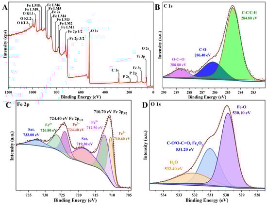 The surface element composition, chemical state, and electronic state of the α-Fe2O3/Fe3O4 MNCs were analyzed by the XPS method, and their XPS spectra are displayed in Figure 9. Firstly, all the peaks were calibrated using the binding energy (BE) of C 1s in the vacuum system (284.80 eV) as a reference [24]. As shown in Figure 9A, the BE of the C 1s peak is 284.85 eV; thus, the C 1s, Fe 2p, and O 1s peaks were calibrated with 0.05 eV of the chemical shift, as shown in Figure 9B–D. Figure 9C presents the high-resolution XPS spectrum of Fe 2p; the characteristic peaks appeared at BEs of approximately 710.70 eV and 724.40 eV, corresponding to Fe 2p3/2 and Fe 2p1/2, respectively [25], and the peaks around 719.10 eV and 732.80 eV belonged to the satellite peaks, which arose from the charge transfer screening. Upon deconvolving the Fe 2p characteristic peaks via Gaussian–Lorentz profile patterns, it was determined that the splitting peaks at high BEs of around 712.30 eV and 726.60 eV were attributed to Fe(III), while the splitting peaks at approximately 710.4 eV and 724.2 eV were ascribable to Fe(II). All the results demonstrated the formation of α-Fe2O3/Fe3O4 MNCs due to the existences of Fe(II) and Fe(III) [26,27]. The narrow spectrum of O 1s is presented in Figure 9D [28]. All the above results demonstrated again the successful formation of α-Fe2O3/Fe3O4 MNCs.
