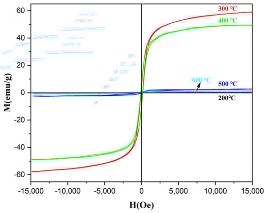 Figure 11. The hysteresis loops of α−Fe2O3/Fe3O4 MNCs calcined at diverse temperatures for 2 h with a mass ratio of 1:6 for β−FeOOH NRs and galactose.