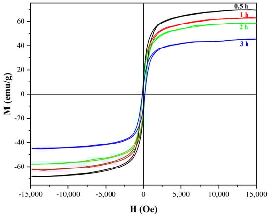 Figure 12. The hysteresis loops of α−Fe2O3/Fe3O4 MNCs calcined at 300 °C for diverse times with a mass ratio of 1:6 for β−FeOOH NRs and galactose.