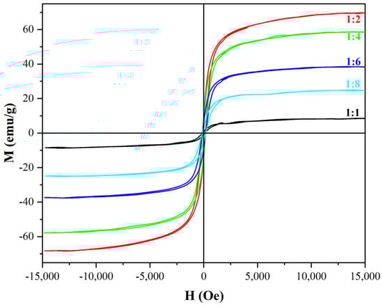 Figure 13. The hysteresis loops of α−Fe2O3/Fe3O4 MNCs calcined at 300 °C for 0.5 h with diverse mass ratios of β−FeOOH NRs and galactose.