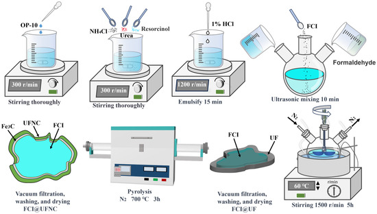 An amount of 2 g of OP-10 was introduced dropwise to 200 mL distilled water and stirred until fully dissolved at ambient temperatures. Subsequently, 18 g urea, 1.8 g ammonium chloride, and 1.8 g resorcinol were added to the above solution. The pH of the solution was adjusted to around 3 by slow addition of a 1% dilute hydrochloric acid solution, and it was emulsified at 1200 r/min for 15 min. The prepared emulsion was then transferred to a four-neck flask, followed by 20 g pre-treated FCI and 36 g formaldehyde solution, and stirred continuously in an oil bath at 60 °C for 5 h at 1500 rpm. Afterward, the FCI@UF precursor was obtained by vacuum filtration and a washing and drying process. The obtained precursor FCI@UF was thermally decomposed at 650 °C under a flowing nitrogen atmosphere for 3 h to obtain nitrogen-doped porous carbon-coated flake carbonyl iron composite (FCI@UFC), which was washed in anhydrous ethanol several times and then dried in a vacuum at 60 °C for 24 h before being utilized. The complete synthesis process for FCI@UF is shown in Figure 1.