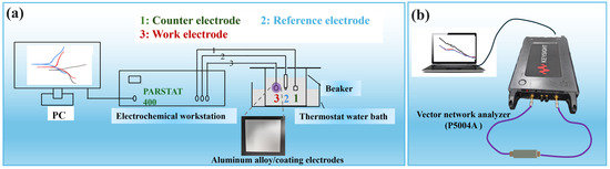 A scanning electron microscope (SEM) equipped with an EDS attachment module was used to observe the microscopic morphology of the samples while analyzing their surface elemental composition and distribution. The crystal structure of the samples was verified using an X-ray diffractometer (XRD) with Cu target Kα radiation, a tube voltage of 40 kV, and a current of 40 mA. The electromagnetic response property was measured by a vector network analyzer (VAN, P5004A, Keysight Co., Ltd., Santa Rosa, CA, USA) through coaxial ring testing (Figure 2a). All samples were uniformly mixed with paraffin at a weight percentage of 70% and then processed to a toroidal shape with an outer diameter of 7 mm and inner diameter of 3.04 mm. Testing was conducted within the frequency range of 2~18 GHz, and electromagnetic parameters were simulated and calculated for reflection loss (RL) via transmit-line theory [19,20,21]. Electrochemical tests were conducted using a CS350 potentiostat, utilizing a three-electrode system (Figure 2b). The setup included an Ag/AgCl electrode as the reference electrode, a carbon rod as the counter electrode, and a coated aluminum alloy as the working electrode. Electrochemical Impedance Spectroscopy (EIS) was performed over a frequency range of 105 to 10−2 Hz with an AC voltage amplitude of 10 mV. Polarization curves were recorded using linear sweep voltammetry at a scan rate of 0.5 mV/s.