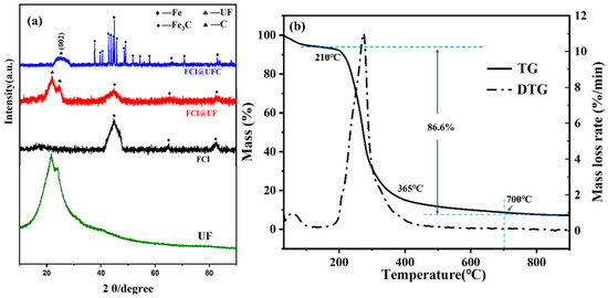 (a) XRD patterns of FCI, FCI@UF, UF@UFC; (b) The TG/DTG curves of pure UF in N2 atmosphere (room temperature—900 °C).
