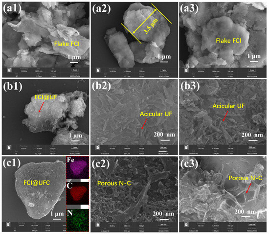 SEM Images: (a1–a3) FCI, (b1–b3) FCI@UF, (c1–c3) UF@UFC; the illustrations of (c1) are EDS mapping of Fe, C, and N elements.