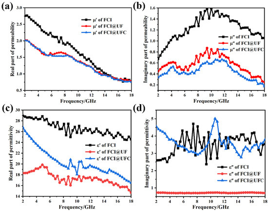 Figure 5a,b, respectively, present the variations of the real part (μ′) and imaginary part (μ″) of FCI, FCI@UF, and FCI@UFC with frequency. In the graphs, as compared to FCI, both FCI@UF and FCI@UFC exhibit a decreasing trend in μ′ and μ″. This can be attributed to the non-magnetic UF or nitrogen-doped porous carbon situated between the magnetic FCI particles, which weakens the magnetic moment interactions among FCIs. As a result, the free rotation or flipping of magnetic moments is inhibited, leading to a decrease in the saturation magnetization of iron powder, thereby causing a reduction in the μ′ [28]. The presence of the coating layer also changes the coupling strength between electrons and magnetic moments. This alteration leads to a reduction in the energy transfer under external alternating magnetic fields and a weakening of the interaction between magnetic moments and these external alternating magnetic fields. Hence, the imaginary part of the magnetic permeability decreases [29]. As a result, both FCI@UF and FCI@UFC experience a decline in μ′ and μ″. In Figure 6a, FCI@UFC exhibits the lowest tanδm, which indicates the weakest magnetic loss performance among them.