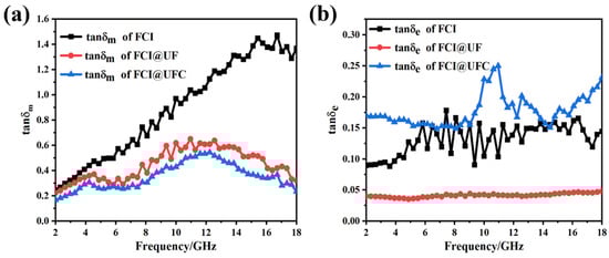 Loss tangents of FCI, FCI@UF, and FCI@UFNC: (a) magnetic loss tangent (tanδm); (b) dielectric loss tangent (tanδe).