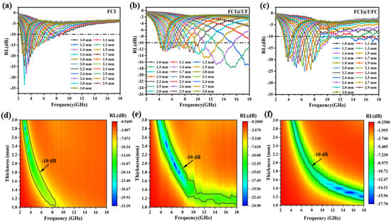 Furthermore, heterogeneous interface structures are formed between FCI, Fe3C, and the carbon layer, capturing a large number of electrons and ions at the interface to form dipoles [36]. Defects caused by in situ doping of N atoms also act as dipoles. The increase in the number of electric dipoles within FCI@UFC implies more frequent relative displacements and energy dissipation phenomena, consequently resulting in greater dielectric loss [37]. The absorption mechanism of FCI@UFC is illustrated in Figure 7. Compared to FCI, FCI@UFC exhibits reduced magnetic loss and enhanced dielectric loss of electromagnetic wave energy. To directly assess the material’s absorption performance strength, the reflection loss of the metal-substrate single-layer wave-absorbing coating is simulated by measured electromagnetic parameters based on the transmission line theory [38]: