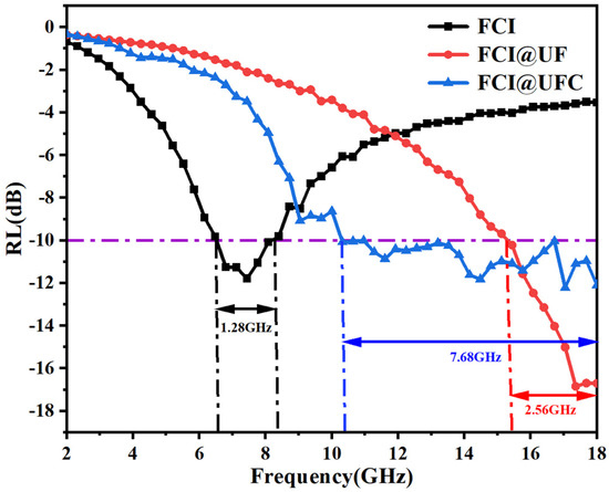 When simulating an absorption layer thickness of 1.2 mm, the effective absorption bandwidth with RL < −10 dB ranges from 10.32 to 18 GHz. Figure 9 displays the RL curves of the three samples at z = 1.2 mm, providing a clearer presentation of the differences in the microwave absorption performance between FCI, FCI@UF, and FCI@UFC.