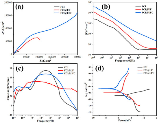 Electrochemical curves for FCI, FCI@UF, and FCI@UFC: (a) Nyquist plots, Bode plots: (b) relationship between impedance modulus and frequency, (c) relationship between phase angle and frequency, (d) Tafel plots.