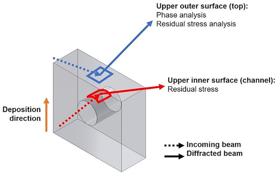 Residual stresses were measured at the central positions of the outer top surface of the specimens, exactly above the channel, and on the inner top surface of the channel, while scanning for phase identification was performed only on the outer top surface, as shown in Figure 3. Attention was also given to the stress state on the upper surface of the specimen for two reasons: (1) porosity distribution in the region below may influence residual stress levels, and (2) in hot stamping conditions, this surface will be in contact with heated blanks and thus constantly exposed to wear and thermomechanical fatigue. After scans, stress calculations were performed in a self-developed module running in the MathWorks MATLAB R2015a software (Natick, MA, USA).