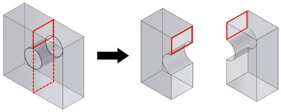 The design of the channel specimens for LPBF is shown in Figure 1. Channels were manufactured through thickness in both cases (“t1” and “t2”). The variation in thickness was based on the findings of Belloli, Demir and Previtali [9], who observed that the channel’s length can affect the intensity of distortions generated in its circumference. Nevertheless, changes were made to the specimen’s geometry, aiming to abide by design guidelines for the intended application of the manufactured channels in tools for hot stamping of metal sheets [23]. For the same reason, a diameter of 8 mm was set for the channel, based on future application requirements while respecting the limitations of the LPBF technique, and a distance of 11 mm from the center of the channel to the top surface of the specimen was used considering the specified dimensions for hot stamping tool design, sized to meet the mechanical and heat transfer requirements.