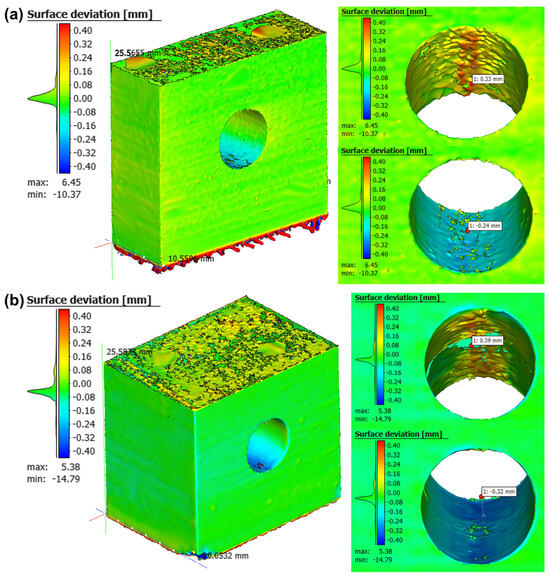 The comparison between the diameters of the designed and printed parts (measured by 3D scanning) is shown in Figure 5 and summarized in Table 3. It is possible to observe irregularities at the top of the channels, caused by the lack of support, leading to the highest average levels of deviation in this region, thereby contributing to variations in relation to the designed diameter value. Specimen “t1” presented a higher deviation, which is in accordance with previous findings indicating that, as the channel length increases, deviation decreases [9].