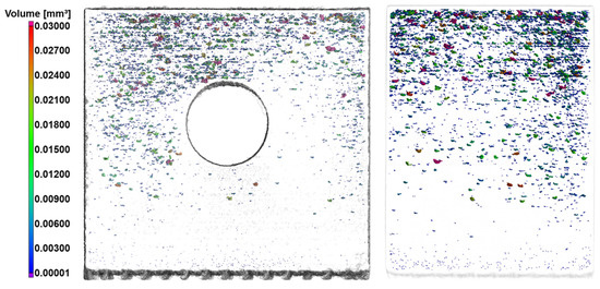 Porosity distribution in specimen “t2”, with volumetric pore classification.