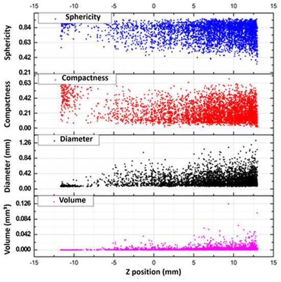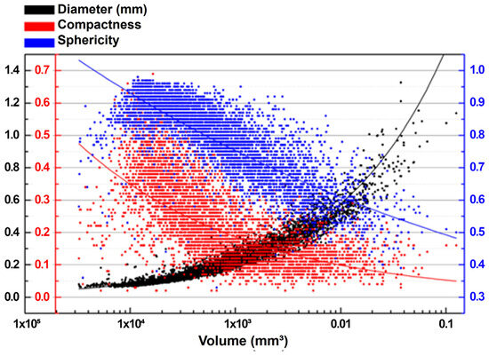 The distributions of pore sphericity, compactness and diameter as functions of volume are shown in Figure 7. Sphericity is a measure of how close a body mathematically resembles a perfect sphere, being the main means of evaluating pore shape [34]. This parameter corresponds to the ratio between the surface area of a sphere with the same volume and the actual pore surface area [35]. The compactness of a pore is defined as the ratio between the volume of the pore and the volume of a sphere with a diameter equal to the maximum diameter that circumscribes the pore [35]. Generally, the greater the volume or diameter of the pores, the lower the sphericity and compactness. Pore sphericity and compactness variations are usually ascribed to different pore formation mechanisms, i.e., larger and irregular pores are frequently associated with a lack of fusion, while smaller and more spherical pores are associated with keyhole effects or gas entrapment [32,36]. However, pores can also be associated with voids generated by poor compaction [37], either due to covering problems or irregularities in the material, which is the most likely case in the present study, since the lack of support can cause irregularities in deposited layers.