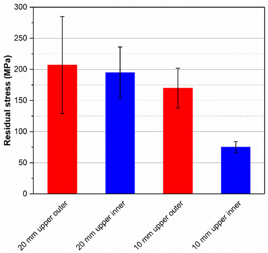 The residual stress values are summarized in Figure 10. A tensile stress state is seen in all assessed regions, which can be ascribed to the “warping” tendency of the unsupported material deposited by LPBF [6,15]. These findings go against those of Belloli, Demir and Previtali [9], who observed compressive stresses in maraging 300 steel channels. Grosjean et al. [13] obtained a stress profile going from compressive on the specimen surface to tensile in the vicinity of the channel; their study, however, involved a change in the deposition strategy for the final layers to improve surface finishing. Moreover, measurements were carried out on the surface parallel to the printing direction (XZ/YZ), not on the channel and specimen’s top surfaces (XY), as in the present case, meaning that the stresses were measured in different directions. General trends include stress reduction from specimen “t2” to “t1” (decreasing thickness), and lower stress levels on the upper inner surface of the channel as compared to the upper outer surface of the specimen. However, these differences are almost negligible due to the relatively high associated errors, which can be caused by the roughness of surfaces produced by LPBF, especially inside the channel, likely due to the coarseness of prior austenite grains with columnar growth and the eventual textures that can also arise from the process. The most notable difference is between channels with different lengths (“t2” vs. “t1”). The fact that residual stresses are lower for the specimen “t1” than for “t2”, especially inside the channel, while the surface deviation results present an opposite behavior, being higher for the channel in “t1”, might suggest that the lack of support structures allows higher levels of distortion to take place during processing, with a consequent effect of stress accommodation and relief. In fact, the magnitudes of residual stress (pre-relief) and distortion (post-relief) are directly correlated, as shown by Mugwagwa, Yadroitsev and Matope upon analysis of LPBF-printed cantilevers made of maraging steel 300: the higher the stress level in the cantilever before cutting, the higher the resulting distortion after cutting [45]. It is worth mentioning that the presence of porosity can produce a stress relief effect and reduce distortions as well [46]. Negligible stress variation on the outer surface of samples indicates that the channel region is the most sensitive one to the effects of LPBF processing, while the stress state on the outer surface most likely results from a combination of rapid cooling due to contact with open air and to the intensified porosity concentration in the final building layers.