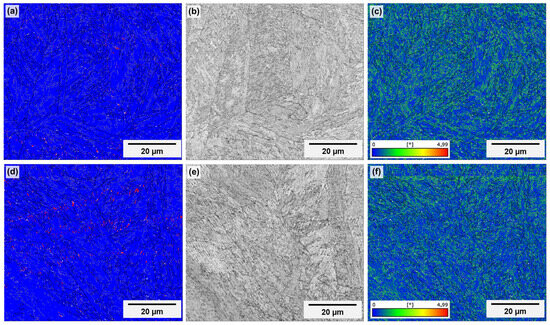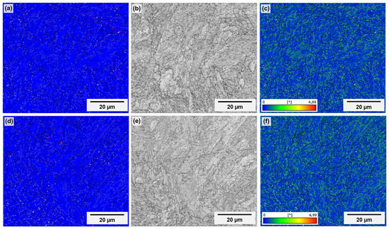 To compare the quality of both regions, two parameters were chosen: the pattern quality (images “b” and “e” in Figure 12 and Figure 13), and the Kernel average misorientation (KAM) (images “c” and “f” in Figure 12 and Figure 13). Pattern quality gives off information such as defect density or recrystallization state because the quality of the diffraction pattern is directly affected by the degree of deformation of the material, being lower in more defective microstructures. KAM is useful to assess the dislocation density because it is particularly sensitive to low-angle misorientations and is calculated as the average misorientation of a specific data point with its nearest neighbors [56]. The images, however, show no appreciable differences between both regions in the same specimen and between the same regions in both specimens.