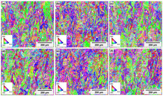 Low-magnification IPF maps in the X (a,d), Y (b,e) and Z (c,f) directions of the upper outer specimen surface (a–c) and of the upper inner channel surface (d–f). The building direction corresponds to the height of the images.
