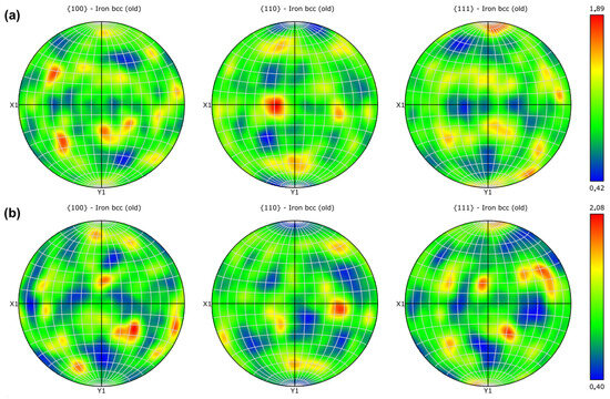 Pole figures: (a) upper outer specimen surface; (b) upper inner channel surface.