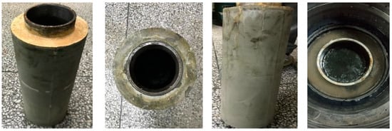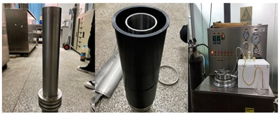 As shown in Figure 1, the cement ring integrity apparatus (Self developed equipment, China) is used to simulate the conditions encountered in the field, testing the sealing performance of cement rings under variable pressure. The process involves preparing the apparatus by installing the cement ring inside the device, followed by sealing it with a rubber casing. The cement ring is subjected to internal variable pressures, which simulate real-life conditions. The apparatus ensures the integrity of the cement ring’s seal through a series of steps, including setting the pressure and monitoring for any leakage. Finally, the results are observed to assess the sealing effectiveness, ensuring the cement ring maintains its structural integrity under stress.
