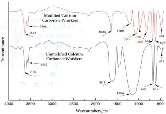 From Figure 2, it can be observed that ordinary calcium carbonate whiskers exhibit distinct characteristic peaks. The peaks at 3618 cm−1 and 3552 cm−1 correspond to the stretching vibration absorption of crystallization water and surface -OH groups, respectively. A bending vibration peak of crystallization water is observed at 1468 cm−1. The peak at 1617 cm−1 is attributed to the characteristic absorption of the active Ca2+ ions on the whisker surface. Additionally, the peak at 1154 cm−1 corresponds to the antisymmetric stretching vibration of tetrahedral SO42− groups, while peaks at 670 cm−1 and 605 cm−1 represent the asymmetric bending vibrations of SO42− groups. Lastly, a symmetric bending vibration peak of SO42− groups appears at 471 cm−1.