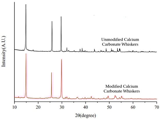 The XRD patterns of ordinary calcium carbonate whiskers and modified calcium carbonate whiskers are presented in Figure 3.