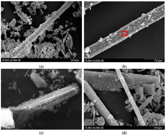 Surface morphology of modified whiskers. (a) 2500× magnification of the sample; (b) 3000× magnification of the sample; (c) 5000× magnification of the sample; (d) 5000× magnification of the sample.