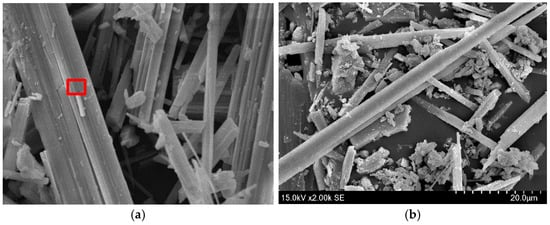 Modified whiskers embedded in the cement matrix. (a) 2000× magnification of the sample; (b) 5000× magnification of the sample.