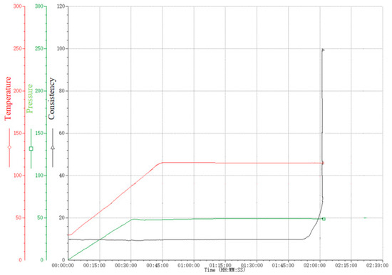 To investigate the impact of the optimal 5% dosage on cement slurry properties, the basic performance of cement slurry and the mechanical properties of cement stone were evaluated. The proportions of the cement slurry formulation were based on established guidelines for high-temperature cementing applications and the experimental conditions in this study. A base formulation consisting of Class G oil well cement, silica fume, and a series of additives was selected to ensure a balanced slurry with stable rheological properties, fluid loss control, and high-temperature resistance. The inclusion of 30% silica fume was chosen based on its proven ability to enhance the strength and durability of cement systems, particularly in high-pressure, high-temperature environments. The selected additives were included in proportions consistent with standards API 10B-2 [34] to optimize slurry performance under the experimental conditions of 150 °C. The water-to-cement ratio of 0.44 was chosen to maintain adequate slurry consistency while ensuring optimal thickening and setting behavior.