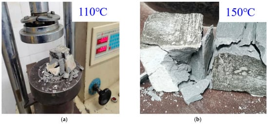 Compressive strength testing of composite resilient cement stone. (a) Compression fracture of samples cured at 110 °C; (b) compression fracture of samples cured at 150 °C.