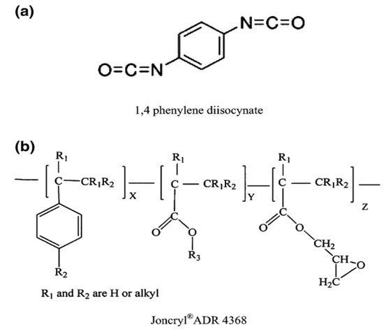 Chemical structures of chain extenders; (a) 1,4 phenylene diisocynate, (b) Joncryl® ADR 4368 [33].