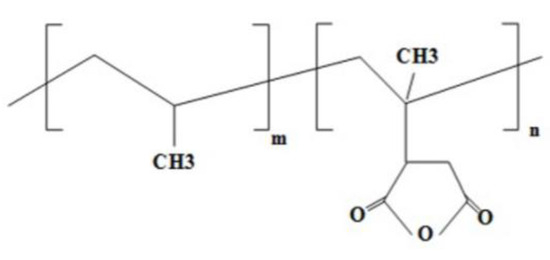 Lozano-Gonzalez et al. [34] observed that although condensation and trans-reactions were achieved, the molecular weight increase due to chain extension could lead to the severe deterioration of nylon upon repeated melting cycles. Studies have shown that virgin PA6 can be maintained for up to seven processing cycles without significantly affecting its physical–mechanical properties or morphology, with the only observed difference being a change in color. After the seventh cycle, the quality declines; however, it has been determined that quality can be improved by blending with virgin material or by adding chain extenders. Various chain extenders have been used effectively in the modification of PAs. Prominent chain extenders include diisocyanate [35], caprolactam [36], trimellitic anhydride [37], and polyepoxides [38]. Costa et al. [39] successfully improved the compatibility of PA6/recycled polyethylene terephthalate (PET) blends using an epoxy-based chain extender and reported that the use of a 1.5% chain extender increased the compatibility. Similarly, Luna et al. [40] observed improved compatibility in PA6 blends modified with maleic anhydride and acrylic acid derivatives, noting that the formation of copolymers increased this compatibility. Ueda et al. [41] investigated carbon fiber (CF)-reinforced PA6/PP blends for water-resistant thermoplastic composites, showing that these blends improved their water resistance. Furthermore, Nguyen-Tran et al. [42] produced CF-reinforced PA6/PP composites with a carbon nanotube (CNT) content to improve mechanical properties and water resistance in automotive applications. Aparna et al. [43] studied the morphology of a PA6/PP (NP) blend under a tensile test and reported that PA6/PP elongated up to 300% with 12% elongation and the fracture was due to the weak bonding between PP and PA6. These studies highlight the critical role of additives and modifiers in improving the physical and mechanical properties of polymer blends. Sridhar and Doddipatla [44] reported that increasing the CF content significantly increased the tensile strength and modulus of PA6/PP composites, but the mechanical properties of the composites decreased with increasing the PP content. Do et al. [45] reported that the mechanical properties of PA6/PP/CF composites decreased with increasing the PP content, but these composites showed potential for application in high humidity or underwater conditions. Aparna et al. [46] observed that the tensile strength increased linearly as the SCF content increased in PA6/PP blends with 3%, 6%, 9%, and 15% SCF content, but the tensile failure rate remained almost constant. It was stated that the impact strength was lower than the samples without SCF. With a 3% and 4% compatibilizer content, small matrix ruptures and the transverse fracture of the matrix were shown as the reasons for composite failures, while at a 5% compatibilizer content, the matrix shear was found to lead to composite failure. The increase in the compatibilizer amount increased the interfacial adhesion between PA6/PP and caused the composites to take on a reticulated appearance. SEM and FTIR results show that there was a transition from brittleness to ductility in the fracture pattern of the composites with the increase in the compatibilizer content. The plasticization of the composites with a high PP-g-MA content (5%) led to the early yielding of the system and a low tensile strength. These findings reveal that the increase in the compatibilizer content in PA6/PP/SCF blends has significant effects on the mechanical performance and significantly changes the fracture behavior of the composites [46]. The chemical structure of PP-g-MA is given in Figure 2 [47].