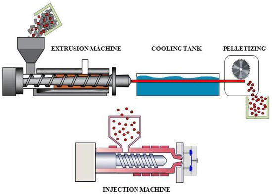 The preparation of the composite samples began with drying rPA6 granules in a ventilated oven at 110 °C for 16 h to eliminate any residual moisture. Following this, rPA6, and 0.2%, 0.5%, and 0.75% by weight chain extenders (CEs) were blended in a co-rotating twin-screw extruder (L/D: 40) at 240–270 °C to form a homogeneous mixture. Viscosity tests and melt flow index (MFI) tests were conducted on the CE-PA6 groups to determine the optimal CE concentration for further composite preparation. Viscosity measurements were performed using the Ubbelohde capillary viscometer by the ISO 307 test standard, with formic acid used as the solvent. The MFI test was conducted according to the ISO 1133 test standard, at a temperature of 265 °C and a constant load of 5 kg to determine the flow behavior of the material. To enhance the compatibility between rPA6 and rPP, 2.5% by weight of PP-g-MA was added, and then CF was incorporated into the mixture. The resulting blend was processed in the same co-rotating twin-screw extruder. An additional drying step was applied to remove any remaining moisture before proceeding with the processing stages. The mixture percentages of the components in the composite blends are provided in Table 1, and the production scheme for the polymer composites is given in Figure 3. Once the composites were thoroughly blended, the test samples were molded using an injection molding machine at temperatures ranging from 265 to 280 °C.