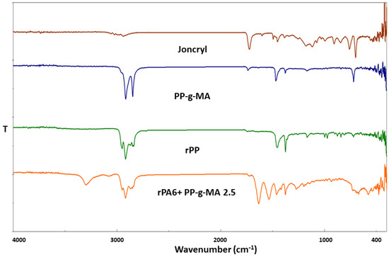 FTIR spectrum of Joncryl, rPP, PP-g-MA, and rPA6+PP-g-MA 2.5 samples.